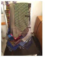 Alkukesästä tuli tehtyä esimerkiksi lahjaksi noin 60 vanhasta kravatista kaksikerroksinen peitto ja liina tilkkutäkki tyylillä sikin sokin erikokoisista paloista. Pituutta yli kolme metriä ja leveyttä toista metriä (tarkkoja mittoja en muista). Oli kyllä haastava ja aikaa vievä projekti.