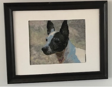 Ajatuksissani on jo pitkään ollut tehdä koirastani Chevystä taulu valokuvasta ristipistoilla. Nyt sain sen viimeinkin toteutettua ja kehystettyä.
